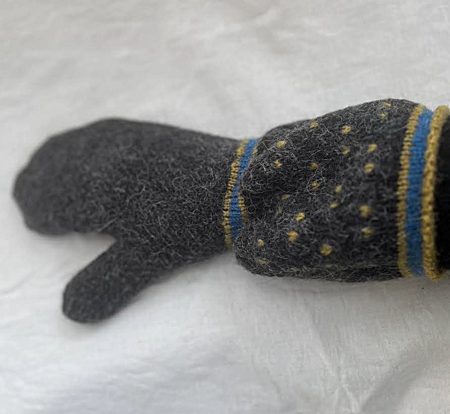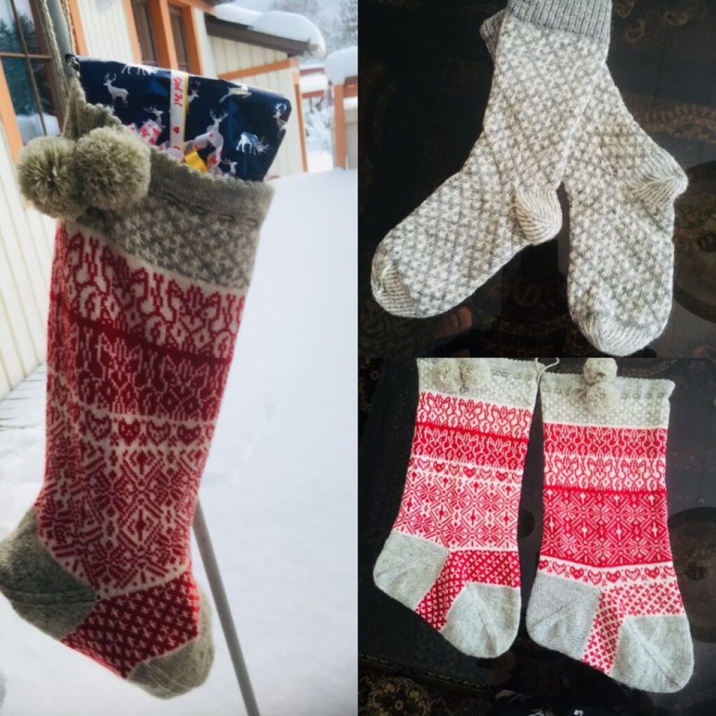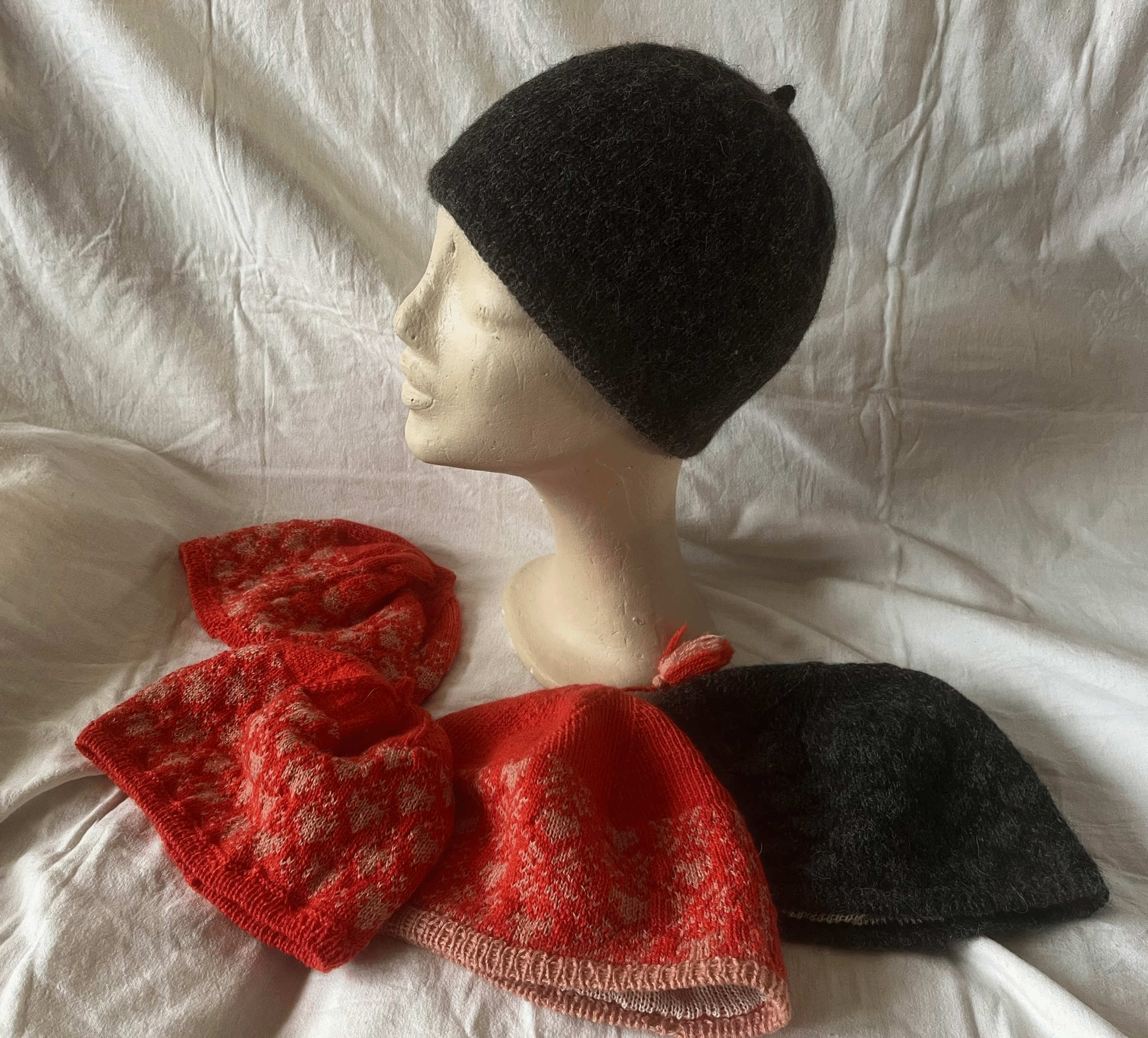 Jag, Margareta, som skapar plaggen gör det på egen finstickmaskin. Med den går det att sticka plagg som är lätta och tunna och ändå värmer bra. Inspirationen till de tvåfärgade mönstren kommer till stor del från snö och fjäll.